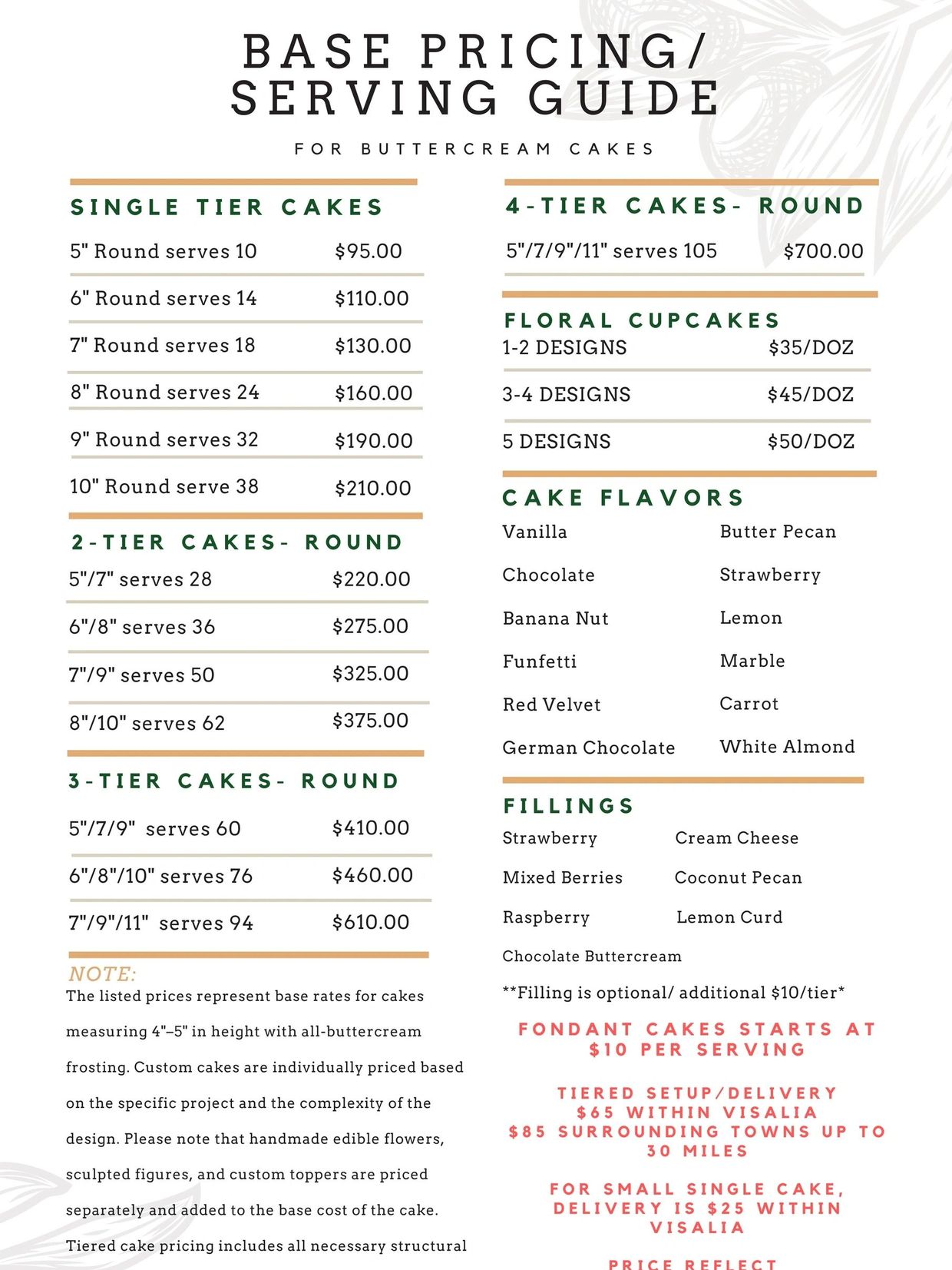 * $85 – Larger 4-5 tiered cakes (within 20 miles)